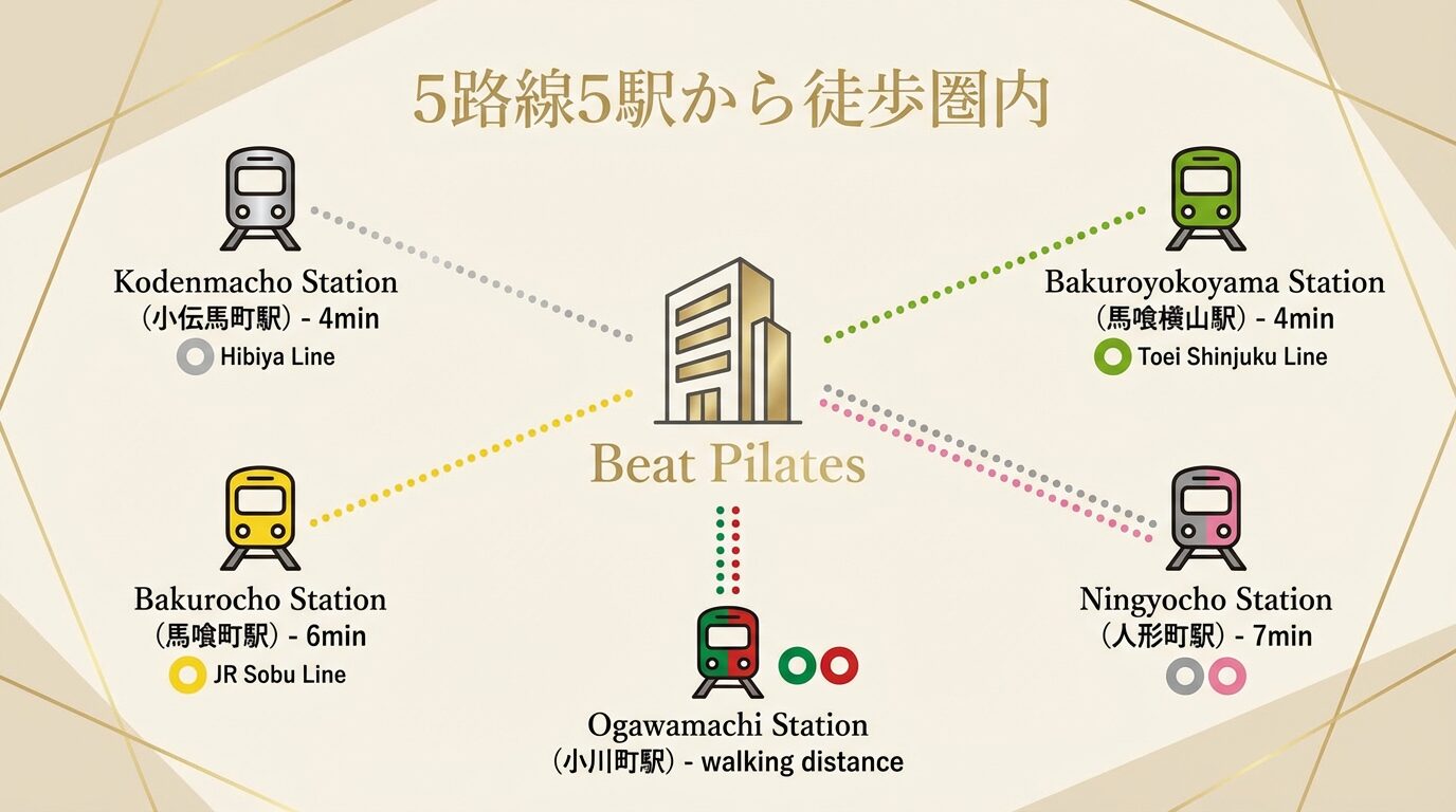 Beat Pilates日本橋小伝馬町店は、なんと5路線5駅から徒歩10分圏内という驚きのアクセスの良さを誇ります。